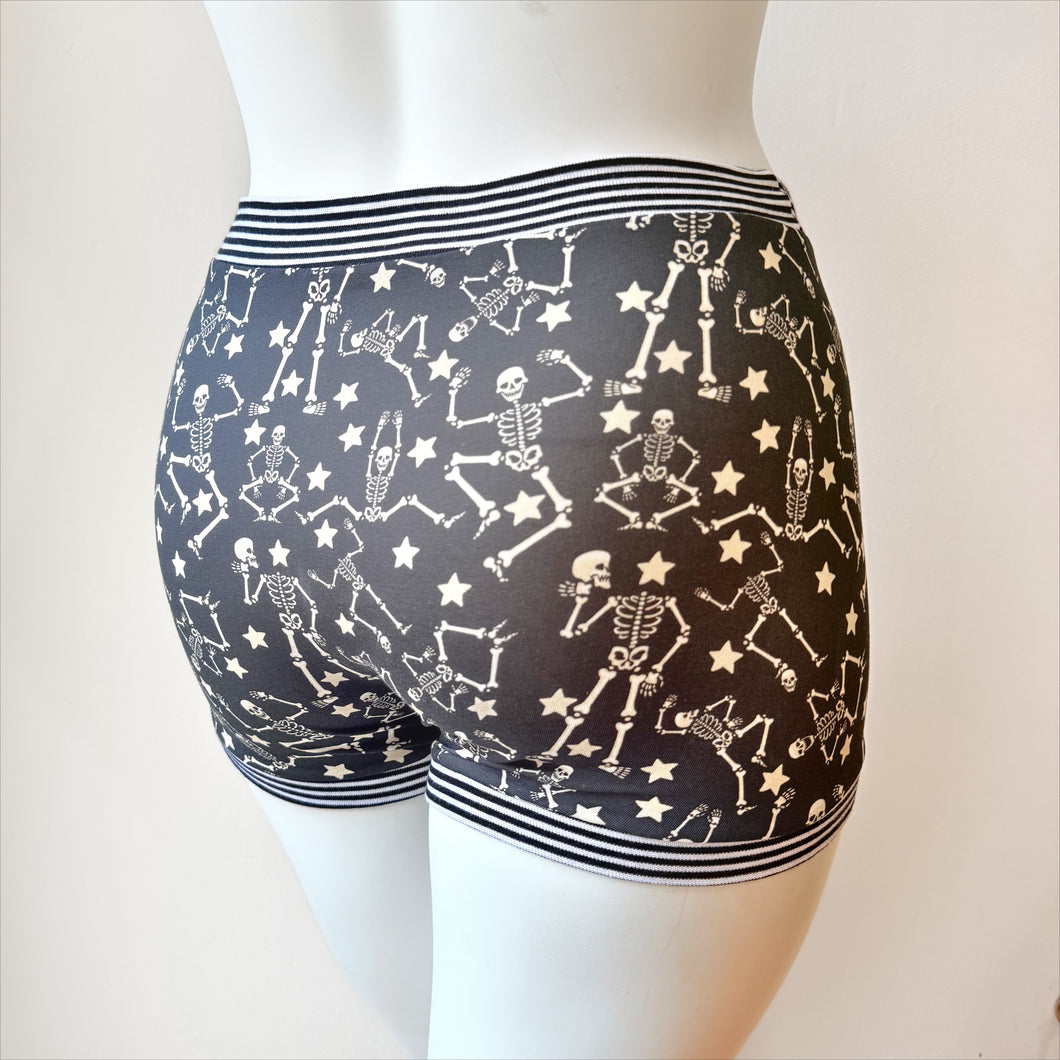Boxers in our Skeleton print. Suitable for either men or women, choose either flat front or pouched front. Our organic cotton underwear is soft, comfortable, breathable and stretchy. No wedgies, no digging in bands, no inside labels, the ultimate comfort pants!