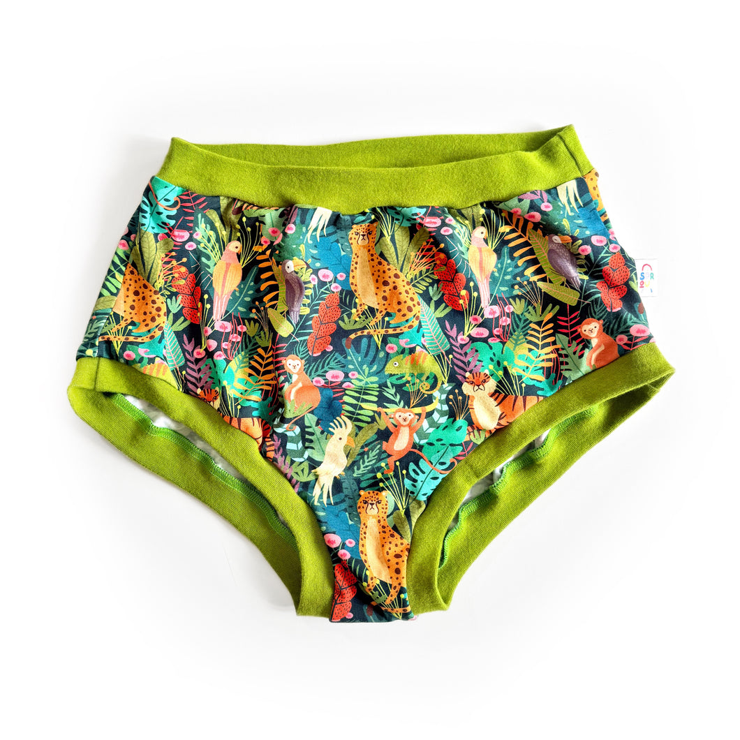 High waisted pants in our jungle print. Our organic cotton knickers are soft, comfortable, breathable and stretchy, offering good bum coverage and a high waist. No wedgies, no digging in bands, the ultimate comfort pants!